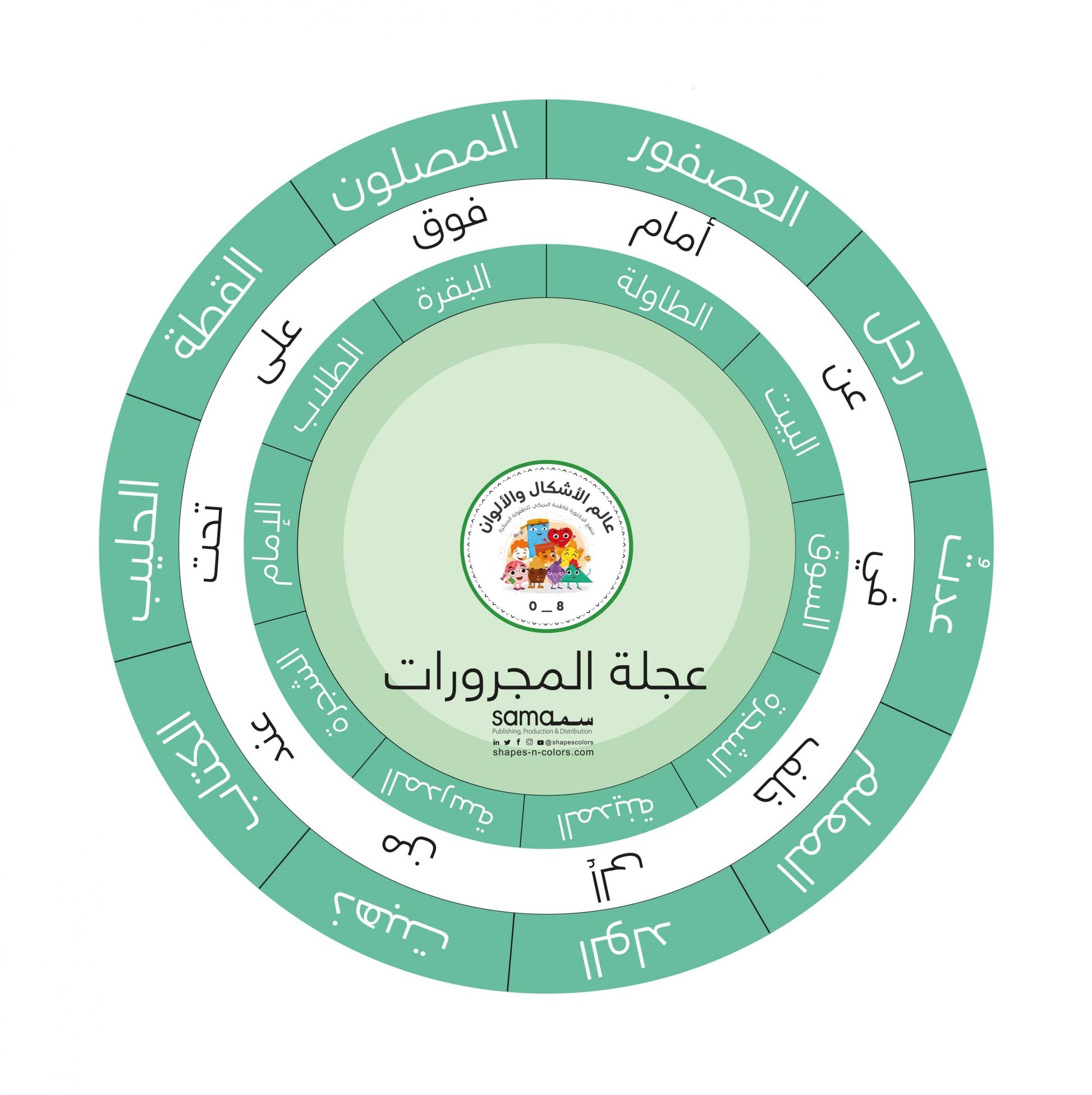 عجلة دوارة، تتكون من 3 طبقات، في كل منها 10 مفردات، أولها هي حروف الجر وظروف المكان التي تغطي الدائرة الكبيرة.