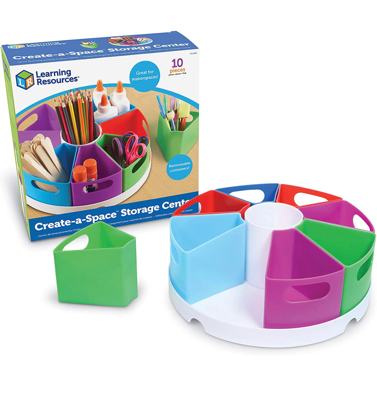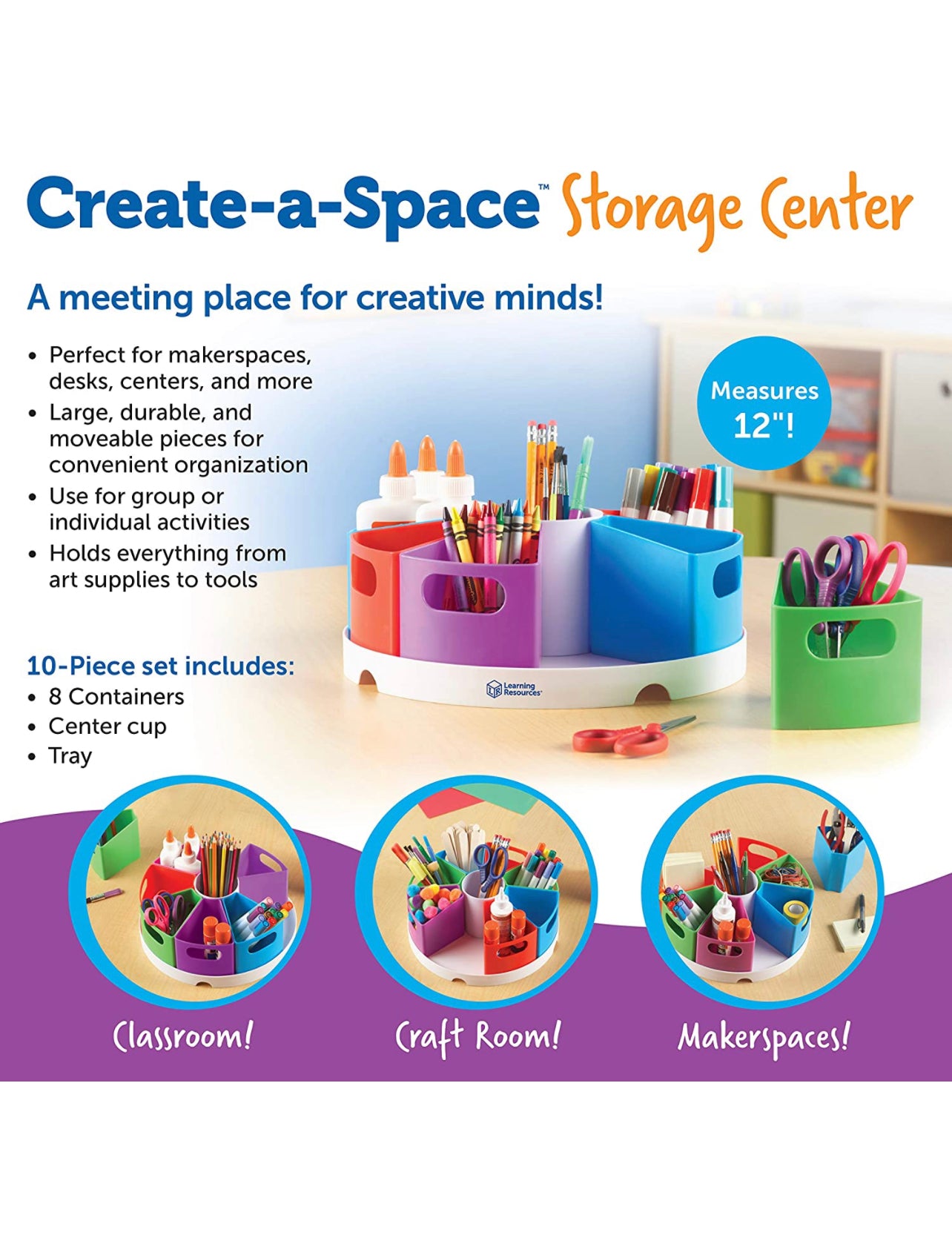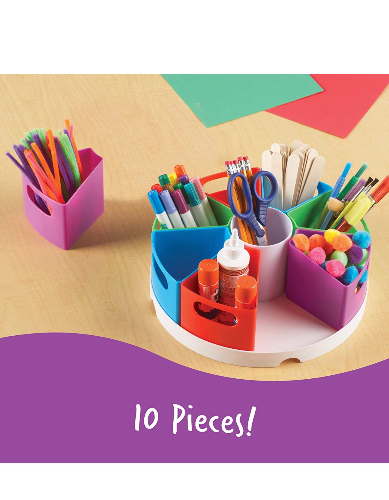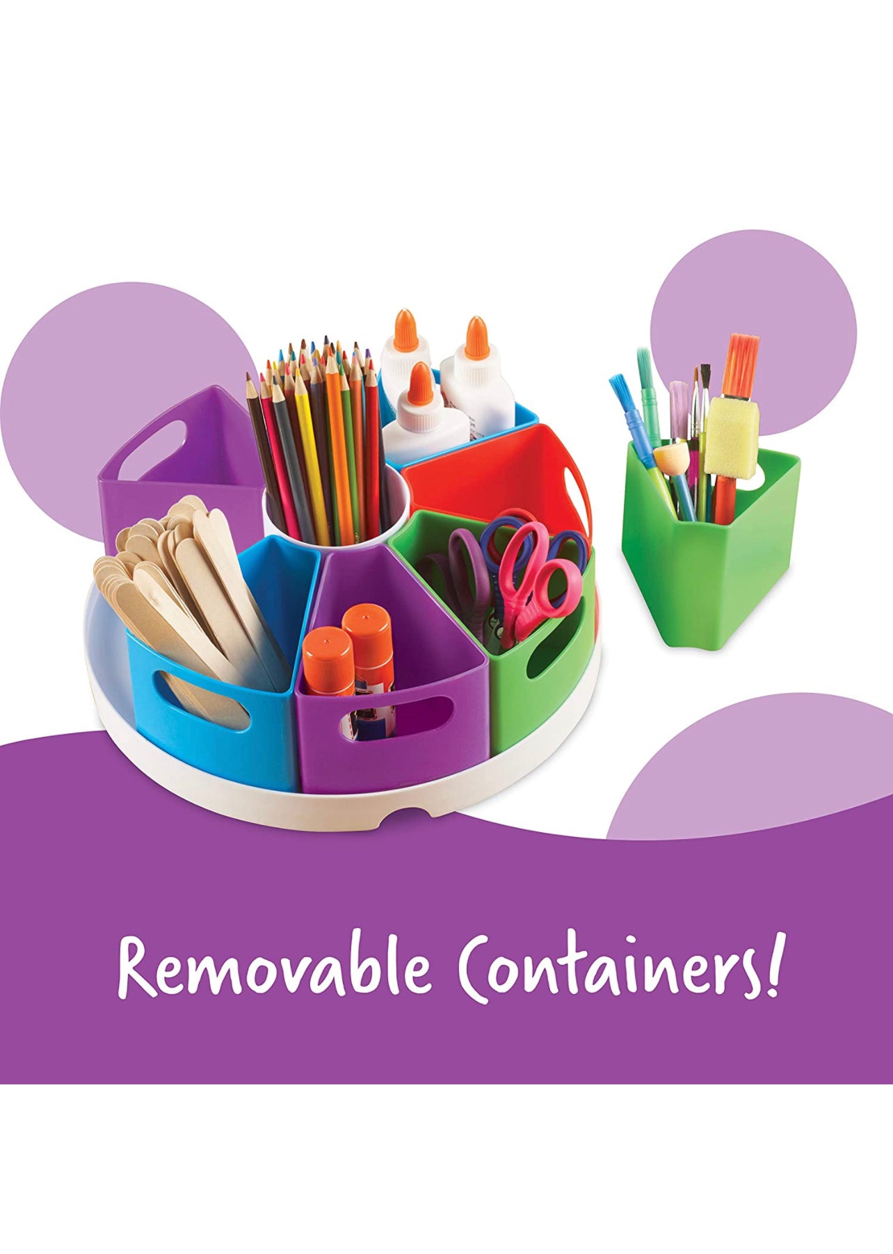 Each of the center's 10 generously sized removable containers holds all kinds of supplies, from glue sticks and markers to scissors, craft supplies, and more!
